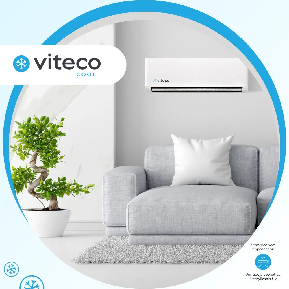 Klimatyzatory Viteco Clima Comfort - wersja Basic z wyposażeniem standardowym w moduły Wi-Fi, posiadają żaluzje powietrzne poruszające się w płaszczyźnie pionowej i poziomej, realizują funkcję jonizacji powietrza oraz sterylizacji powietrza lampą UV.